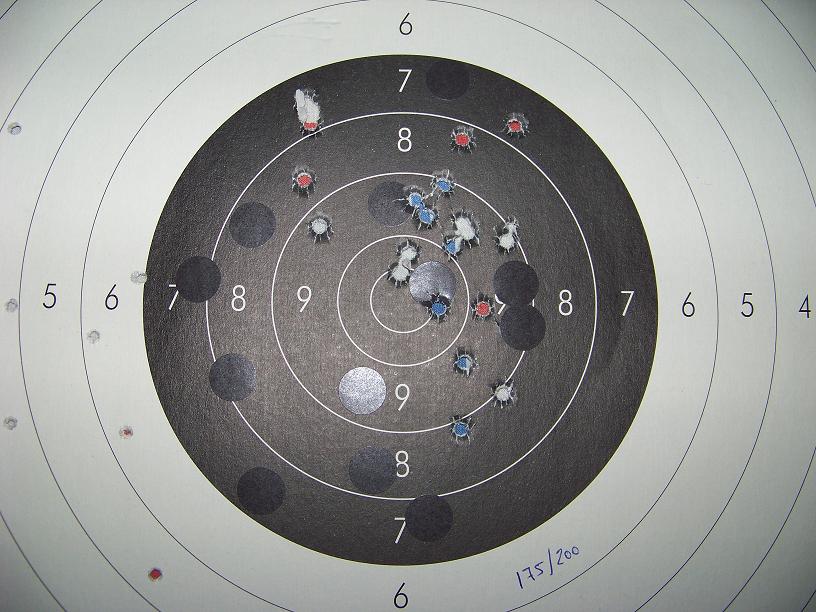 Ahora en serio: en ese blanco se aprecia una dispersion en altura muy notable lo que me da por pensar que el alza se mueve, la dosificacion de pólvora es imprecisa o el tirador "necesita mejorar" y digo necesita mejorar pues la forma de encarar, empuñar o coger el arma inciden ademas del modo de enrasar los elementos de punteria en ese tipo de dispersion. La dispersion en deriva no esta mal del todo pero se puede cerar mas.