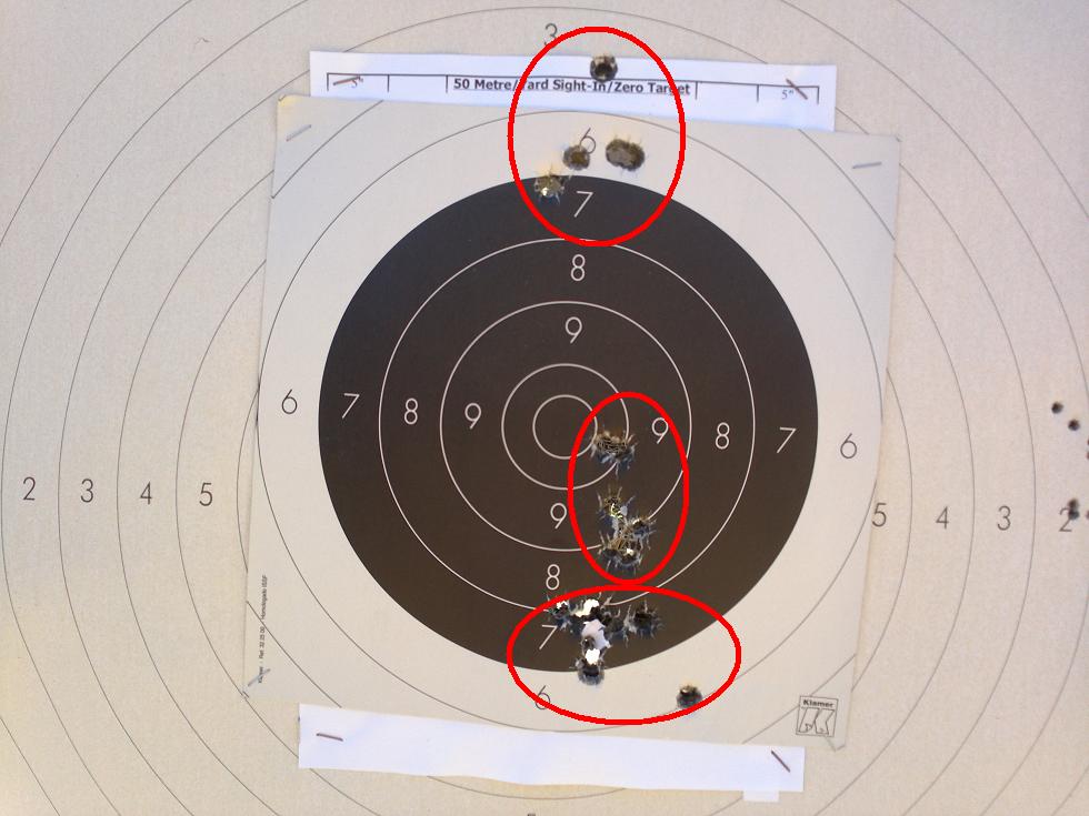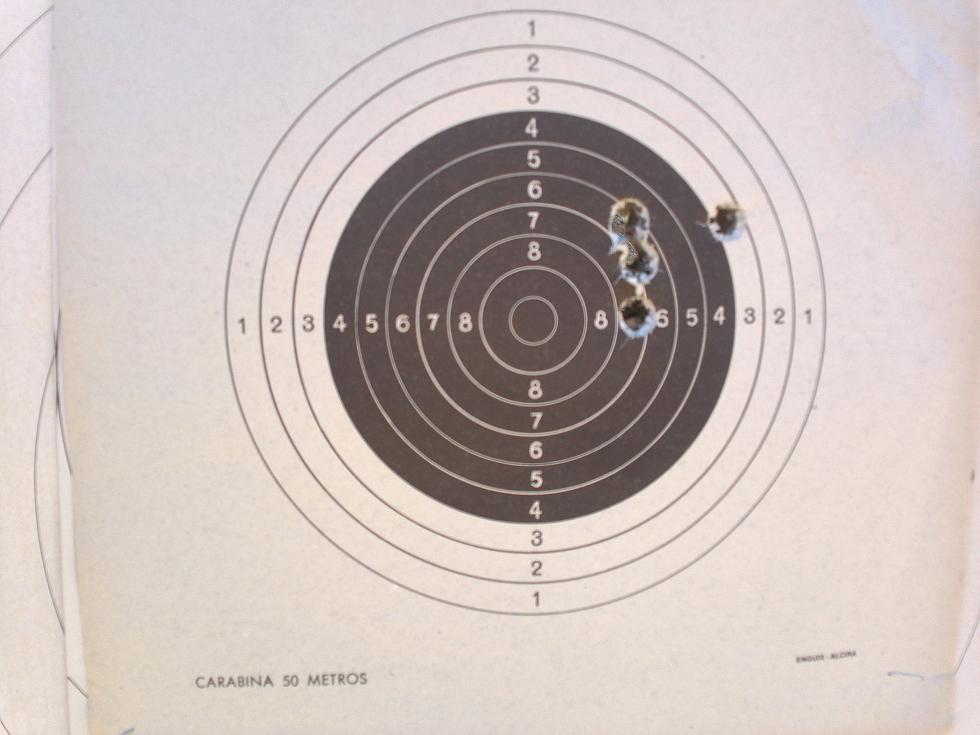 Os pongo las fotos: en una de ellas hay tres agrupaciones correspondientes a tres tipos de carga distintas, siempre la misma bala (bueno, con balas idénticas, que ésto no es la guerra de Gila), sobre los blancos que usamos para pistola 25 metros (pero colocado a 50, como en Veterli). No se han tocado elementos de puntería en ningún momento (diópter y túnel). En la otra foto tenemos una agrupación con blanco de carabina, también a 50 metros. Ya sabéis, ese blanco más pequeño (como la mitad del otro).