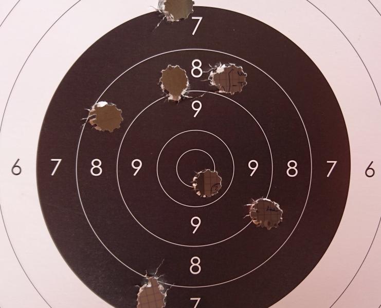 La agrupacion està bastante bien, pero ese rasgado de la cartulina delata la baja velocidad a la que el proyectil hace impacto