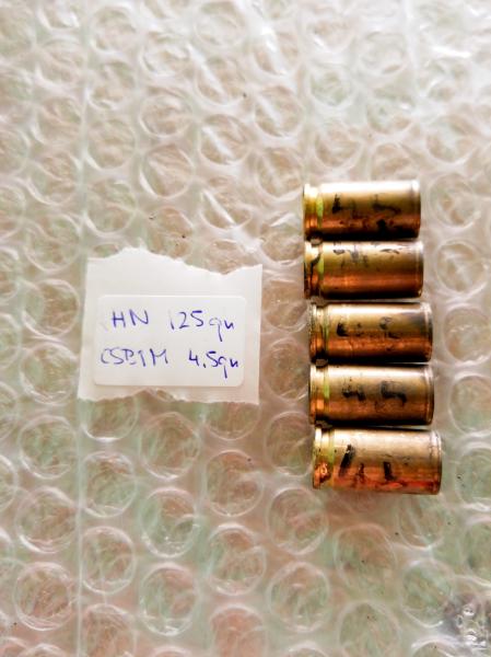 Gracias a un golpe de suerte hoy he podido usar un cronógrafo. He montado vainas usadas con un disparo marca fiochi, puntas hn 125gn .356" hs troncocónicas con 28mm de LTC, 5mm de cota de introducción y crimpadas como se verá en una foto a continuación. Las cargas han sido de 4.1, 4.5 y 4.7gn de CSB1M