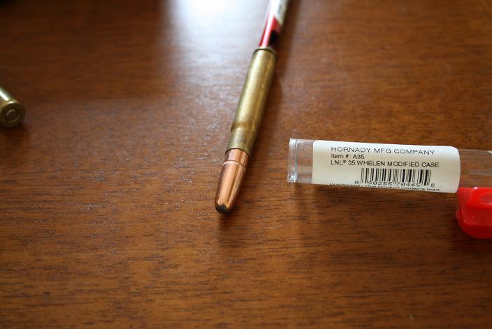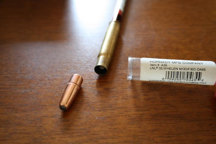 Se trata de la Hornady Imter-Lock calibre .358" de 250 grains RN. Me acaba de llegar (gracias, Iker) para mi .35 Whelen y la voy a disparar desde mi Remington 700 BDL.
