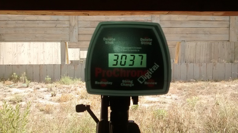 Los cuatro tiros por encima de los 3000 pies por segundo, con un máximo de 3037 p/s (926 m/s). Agrupación muy buena.