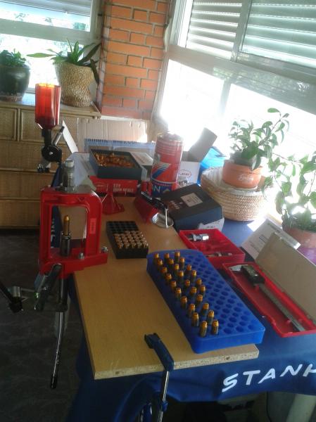 En mi caso, lo tengo absolutamente todo a mano cuando recargo. Puntas, pistones, vainas, bascula, pie de rey, cajas para ir guardando la munición, comprobador de calibre...gafas, lámpara adherida a la prensa para ver con claridad el interior de la vaina una vez ha pasado por la tolva de la polvora...y cuando acabo, el 80% de lo utilizado lo guardo en el mueble que me hice al efecto (mesa con cajones).