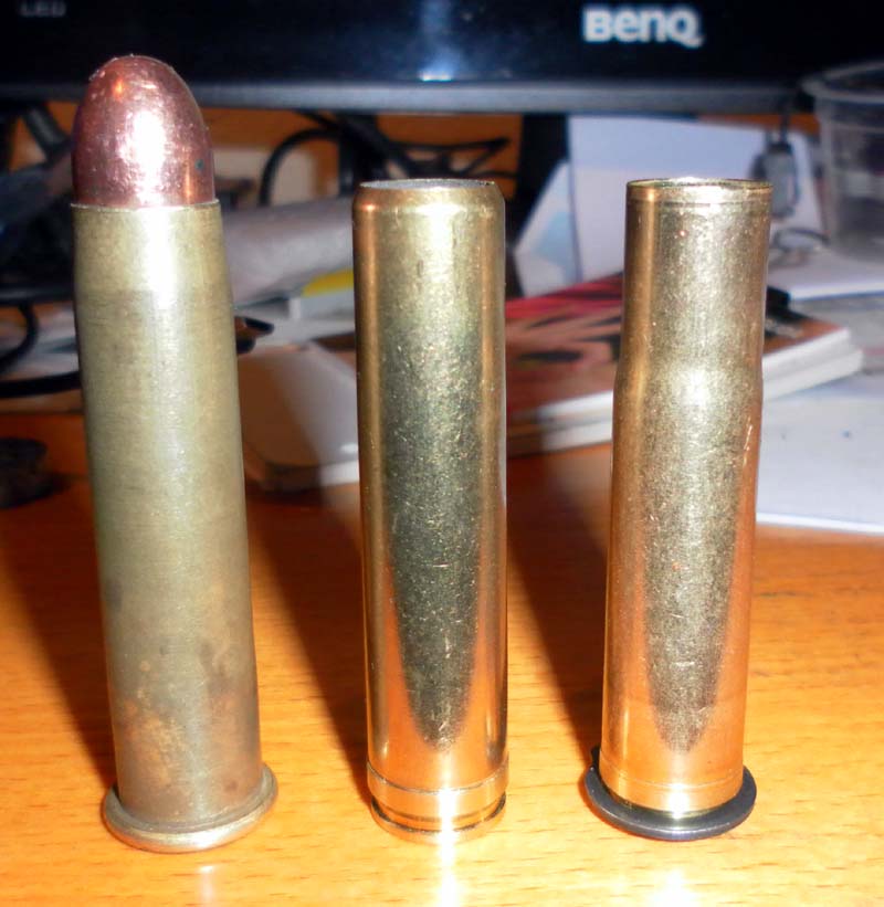 Las primeras vainas del 43 Spanish que compré vi que eran derivadas del 348 Win, y me hice con algunas de ellas. El abotellado se resuelve sin problema mediante un mandril que fuerza su apertura o mediante el mas contundente sistema de "fire forming", pero finalmente tuve que desistir porque el reborde la la vaina del 348 no quedaba bien. En realidad se sujetaba centrado porque su diametro en la base base es incluso algo mayor que la del 43 Spanish Reformado (13.8 frente a 13.3), pero el diámetro del reborde es inferior, al igual que su espesor. Puede que no haya problema, ya que en estas armas el "head space"no es importante, pero me dió un poco de miedo por si no cerraba bien por popa la salida de gases y pasé a las australianas porque no tengo posibilidad de estampar ese reborde que el tal Bertram hace. Es cierto que había leído en los foros que su carácter "agrio" ... pero no entendía la razón de ello, dado que en realidad se trata de una vaina del 348 Win con una envoltura de laton en el reborde. No obstante las recocí en el horno a 210 grados dejándolas enfriar al aire. De hecho he recargado mas de media docena de veces las mismas vainas y siguen como el primer dia (y les meto 45 granos de 2F).