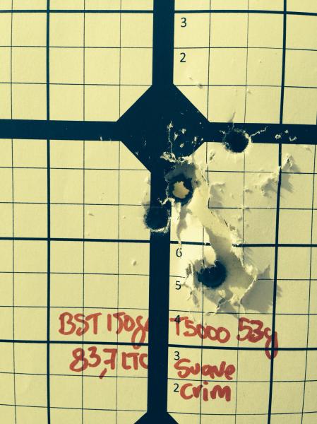 He probado la bst de 150 gr otra vez ahora con 53 gr de t5000. Soy muy cabezota y no quiero abandonar aunque algunos compañeros me aconsejáis q si al rifle no le gusta esas puntas de 150 por su paso de estrías q me olvide y use las de 165 y las de 180 q si van bien.