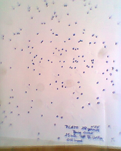 y este fue el resultado con un cartucho con polvora PSB (1,75grms), 34grms de perdigon del 6. Hay 89 impactos que vienen a ser un 30% de impactos. Mas cerca no lo he probado aun. Tendre que ir afinando