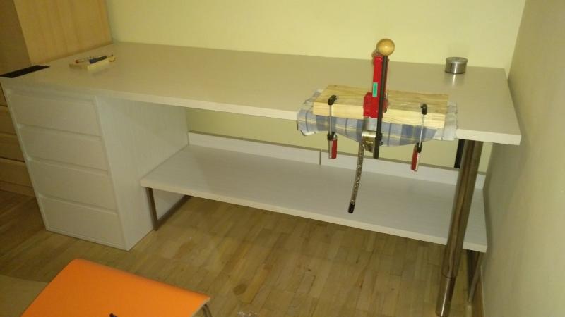 Por si os sirve de idea os pongo el mio, hecho mediante tablas y cajones pedidos por internet, junto con patas de Ikea. Añadí posteriormente un par de estanterias en kit baratas, pedidas tambien online.