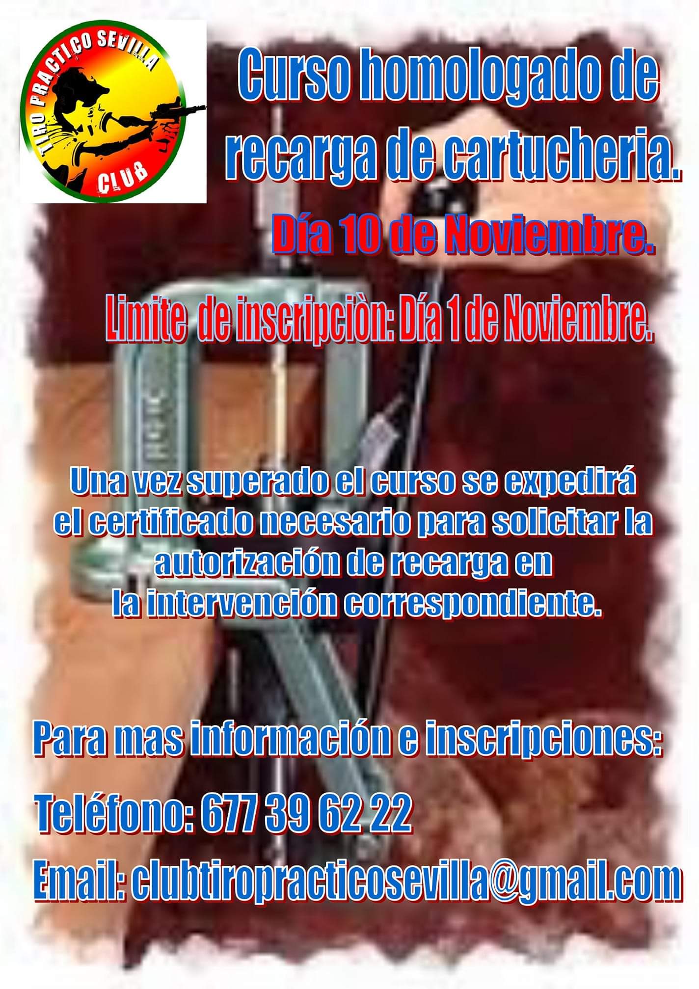 Próximos cursos de Recarga de Cartuchería Metálica Homólogados, uno de los trámites indispensables para obtener la habilitación para la Recarga de Cartuchería Metálica, los días 5 - 11 y 18 de mayo