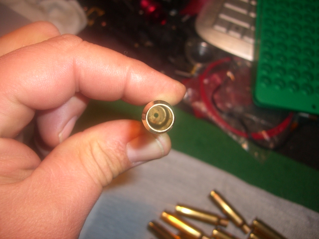 Por la parte de fuera(donde entra el piston) solo le repaso las rebabas que quedan cuando escarias el alojamiento, por dentro le hago un pequeño chaflan a la vez que repaso su diametro. En el tema de hacer chaflan interior hay gente que dice que dan velocidades mas homogeneas, la verdad no lo he comprobado, pero si he visto vainas con rebarbas grandes en esta zona con lo que el peso se va de medida, en vainas Europeas no suele pasar ya que el agujero sale en la extrusion de la vaina en lugar de taladrado pero tambien se lo hago. El diametro del agujero va en consonancia con el calibre no lo recuerdo esactamente pero creo que para el 308 son 1´6mm. Saludos