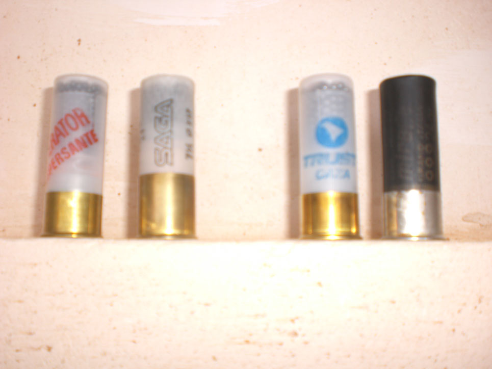 Los cartuchos usados son el 1º cartucho Imperator de 34 grms, perdigón del 8 y taco dispersante con cruz, la polvora la desconozco. El segundo es un cartucho recargado de 32 grms, perdigon del 7 y taco plástico sin copa contenedora , polvora PSB con 1,70 grms. El 3º es un cartucho Trust de 34 grms y perdigon del 6, con taco de plástico con copa y el 4º es un cartucho recargado de 34 grms, perdigón del 6, polvora PSB con 1,75 grms y el taco
