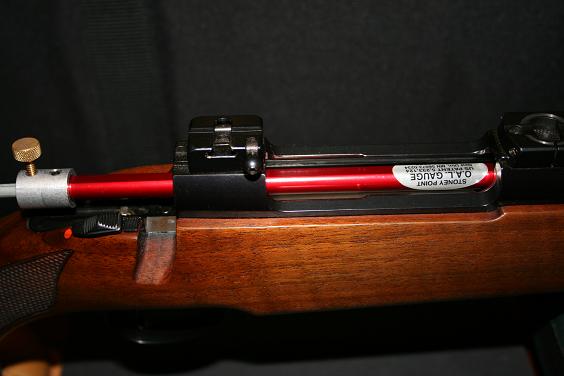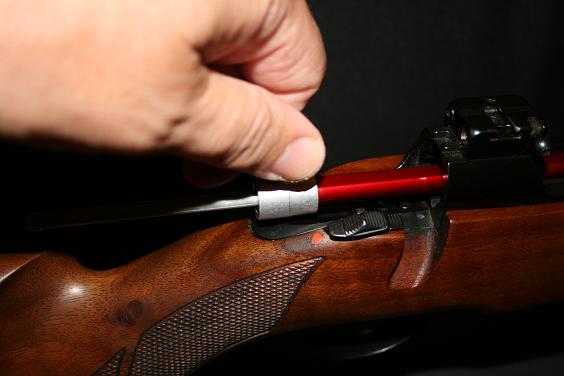 Una vez enroscada la vaina especial al utensilio y puesta la bala que va a tomar medidas, se mete todo el conjunto en el rifle por detrás de la acción, en lugar del cerrojo.