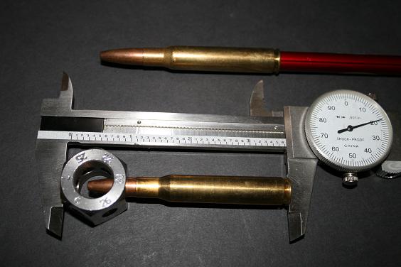 Todo consiste en ensamblar el conjunto medidor con la bala incorporada y metida en el nº 30. Ese nuevo conjunto se mide de extremo a extremo. Recordad que el hexágono mide una pulgada menos dos milésimas; podemos redondear a una pulgada.