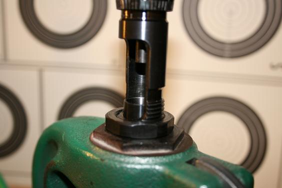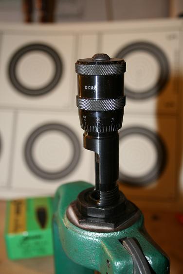 Hay otros dies, como el de la foto, que llevan una ventanita por la que se mete la bala, que cae hasta el cuello de la vaina y ahí se queda enderezada. Más fácil todavía. La pega es que valen más del doble. Es un die con micómetro y un tubo que sube y baja libre; lo toca la vaina cuando sube el pistón y la acompaña, controlando la bala, hasta el empujador. Se sube la vaina hasta que toque el cilindro, se deja caer la bala dentro, y se asienta. Ya está.