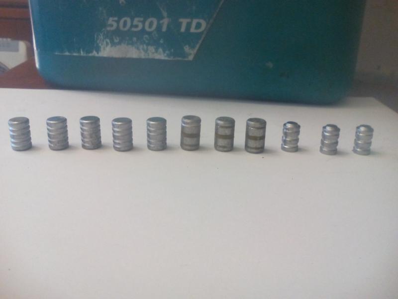 Ningunao de estos wadcutter lleva una brizna de estaño,es plomo de recortes que solo llevan algo de antimonio,reitero no es imprenscindible el estaño.Las del 9 si llevan estaño,por que llevan linotipia,pero si tuviese que hacer yo la mezcla no llevarían nada de estaño,odio profundamente el estaño,solo consigo que las puntas calquen tanto el molde ,que tengo que desenmoldar a martillazos muy violentos,,si la dejas en el molde algun tiempo cae mas fácil,pero yo fundo a toda hostia.