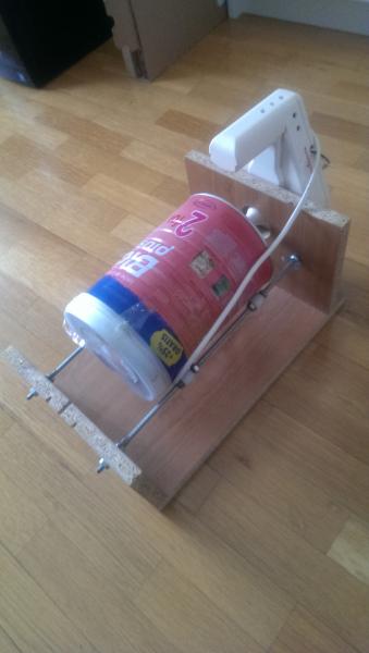Bote de leche en polvo movida por exprimidor viejo.