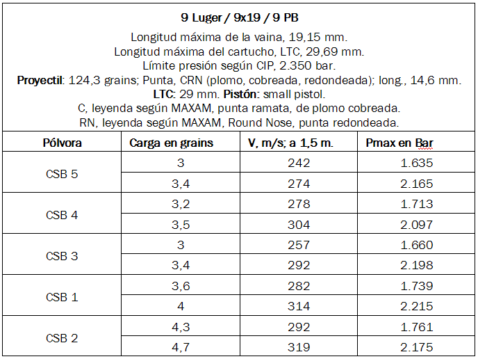 Creo que el bote de CSB 1M trae unas indicaciones en la etiqueta con cargas mínimas y máximas. Al menos en la foto que yo vi las traía. A mayores, mi armero al menos tenía ya datos de recarga. La vivacidad de esta pólvora parece que es algo mayor que la Optima A en sus últimos lotes, y muy parecida si no igual a la Optima A en sus lotes antiguos. Como dato, para punta de 124-125 yo estaba poniendo 4'5-4'7, dependiendo de la pistola, pues para la Shadow me bastaban los 4'5 para una velocidad de 1050 pies/seg y en la Star 30M tenía que subir a los 4'7-4'8.
