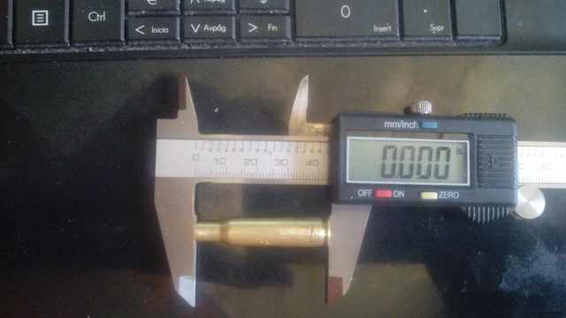Es decir, pones la vaina, ajustas a cero el pie de rey, luego metes el cartucho del .22 de manera que lo que midas sólo sea el culote.