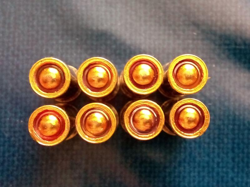 adjunto otras dos fotos de cartuchos ya montados. la foto en la que se ven dos filas son de dos lotes que no me agrupan, mientras que los de la foto de la fila unica si agrupan mas o menos bien. yo no veo ninguna diferencia entre ellos, y todos se recargaron con los dies en la misma posicion y usando el dosificador micrometrico.