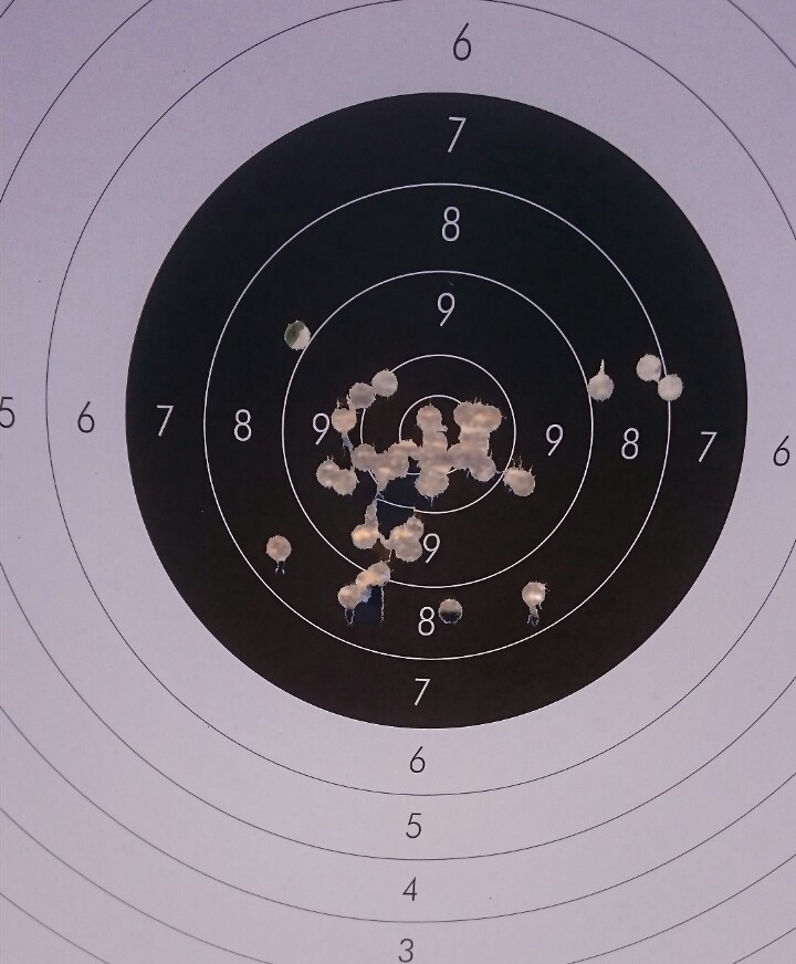 Después de pruebas me quedo con la carga de 1,20gr de la vihtavouri 310, consigo unas agrupaciones muy buenas eso sí, es un tiro más fuerte que con la ba10 que recargada con 1,10gr. La velocidad no la medi pero se aprecia bien que lleva más chicha, también observo que es como más seco el disparo. También decir que tanto antes con la ba10 como ahora con la vihtavouri utilizo pistón magnun y pongo papel para separar pólvora y punta. La punta hn100gr plomo wadcutter y el arma pardini hp32.pongo dos dianas una de precisión y otra de tiro rápido.