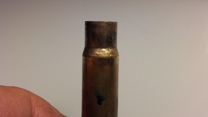 Esas marcas me parece que pueden ser debidas a restos de aceite lubricante o el mismo producto de limpieza, que tiene un gran poder contra las vainas. Igual ocurre si dejamos una gota de lubricante y recalibramos FL: bollo cóncavo. De no ser eso, puede ser suciedad misma (¿es un saut?); lo digo porque no se ve la clásica mancha negra en "manga" bien delimitada, lo que denotaría que los gases rebufan hacia atrás un poco, ensuciando la recámara en esa zona y facilitando que el siguiente tiro deje la vaina marcada. Tanto más si hay problemas de combustión y quedan restos de pólvora sin quemar.