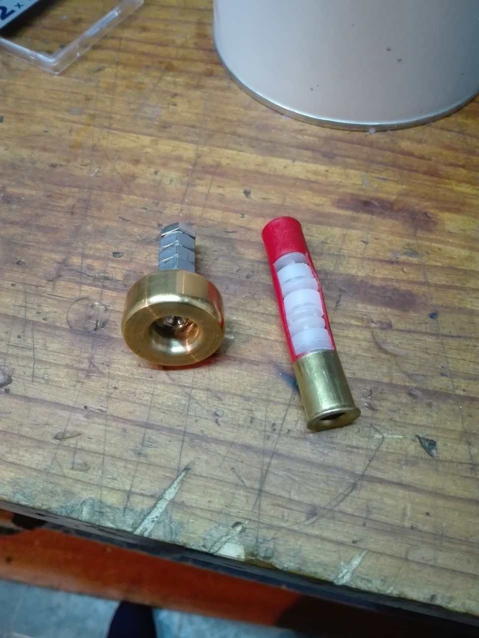 Asi queda por adentro mi cartucho, se que seria mejor rellenarlo con corcho pero tengo mas a mano tacos del 410. Hay que tener en cuenta el peso del relleno porque influira en la presion que generara el cartucho.