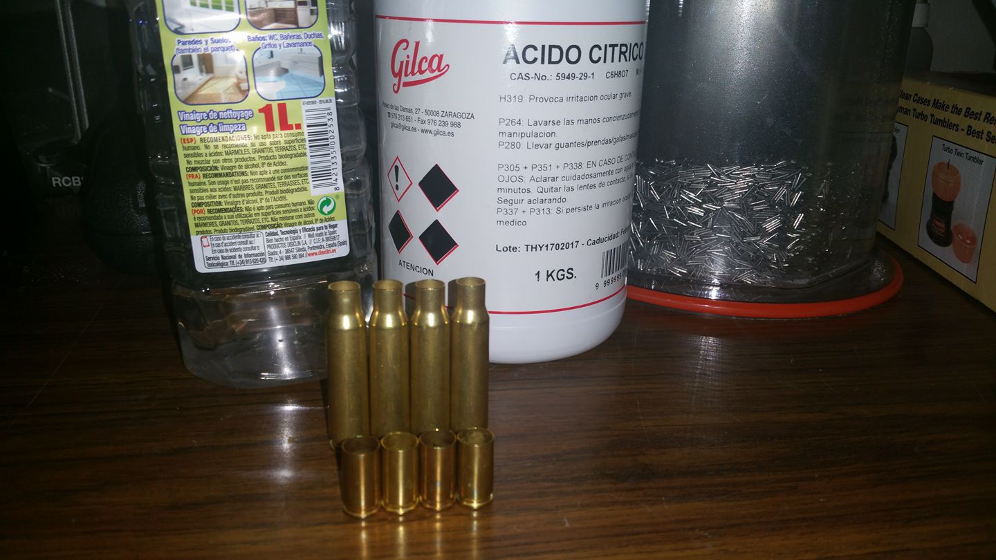 yo por cada 1000 vainas ya sea 308 o 9mm mezcló 1 cucharada sopera de ÁCIDO CITRICO 1 cucharada sopera de jabón de lavadora y un buen chorro vinagre de limpieza