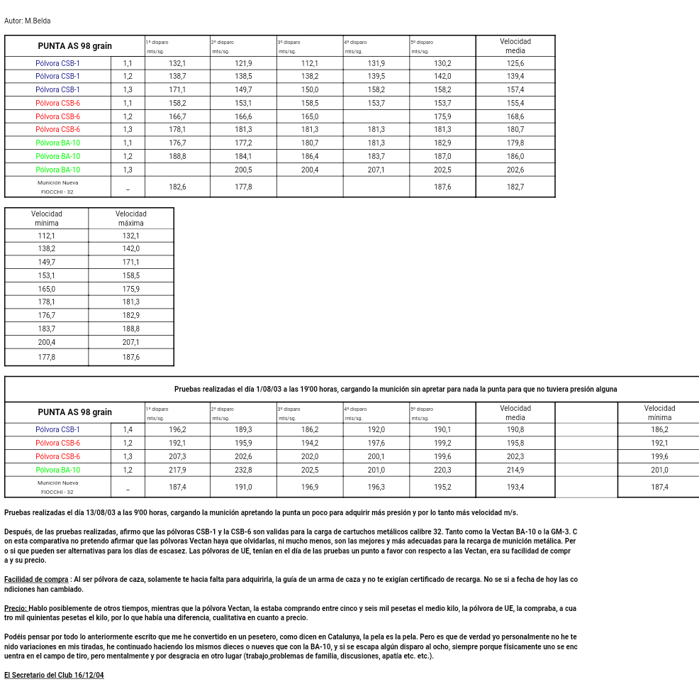 cuando se utilizan pólvoras como la cbs1 para estos calibres, puede ser necesario aumentar las cargas para igualar velocidades necesarias para conseguir esta regularidad, posiblemente pueden llegar producir sobre-presiones, riesgos innecesarios, que no llevan a una buena agrupacion.