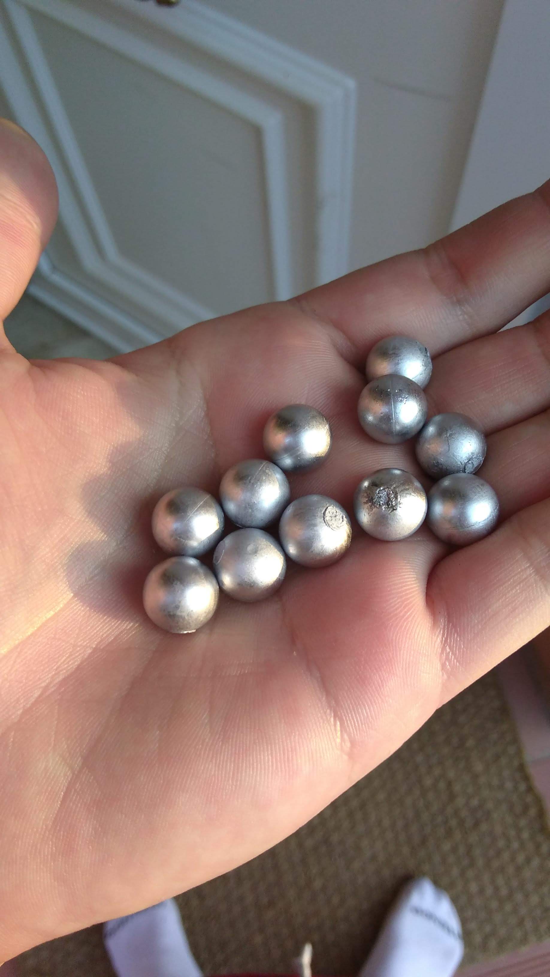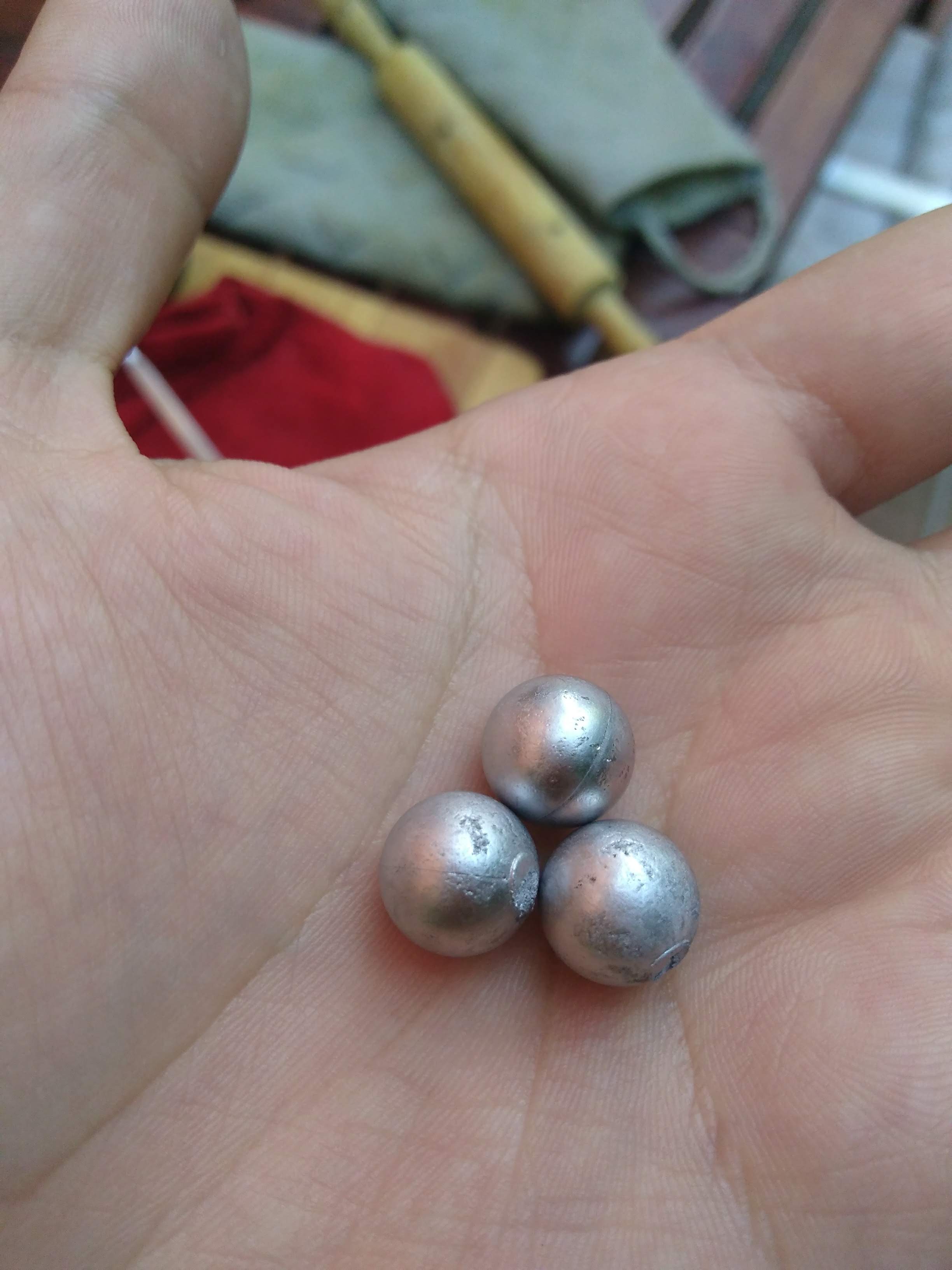 Bueno siguindo vuestros consejos he limpiado el plomo con eso que llaman fluxadoen una sartén aparte y limpie el hornillo también. Calenté a tope el plomo y una vez fundido lo bajé al 5-6. El resultado han sido 125 bolas todas ellas entre 7.94-8.4 gramos de peso y todas al mismo diámetro prácticamente (se me ha acabado la pila del calibre jajaja). Os pongo fotos del resultado. Pero como podéis ver tengo en todas tres variantes: brillo espejo, unas líneas como si hubiera puesto el plomo por capas, que supongo que es fallo mio y un brillo mate pero sin imperfecciones. Alguien sabría explicarme por qué?