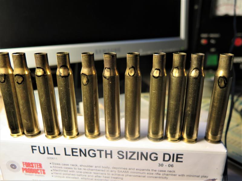 Llevo cuatro años recargando 30.06 y al cambiar de die por el que se ve en la foto, observo que al recalibrar la vaina lubricada minimamente, veo que en la zona del cuello o zona próxima aparece un bollo, no en todas pero si en vainas que aparentemente no tenían ningún problema en la zona y he revisado antes de pasarla por el die.