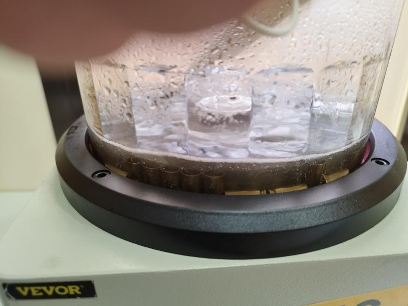 Cuando voy a sacar las vainas hay que dejar suficiente agua en el tumbler para que las vainas estén sumergidas (si está muy sucia y no ves nada cámbiala varias veces), las vas cogiendo una a una y les das una par de golpecitos por la parte del cuello contra la masa de pines que están aún magnetizados por estar en el tumbler. Así los pines que puedan quedar dentro salen quedándose pegados a la masa de pines. Cuando las voy sacando las voy echando en un tarro de salchichas (largas) hasta arriba de agua al que he añadido una cucharadita de poste de bicarbonato. Cuando están todas cierro el tarro y las agito durante un minuto.
