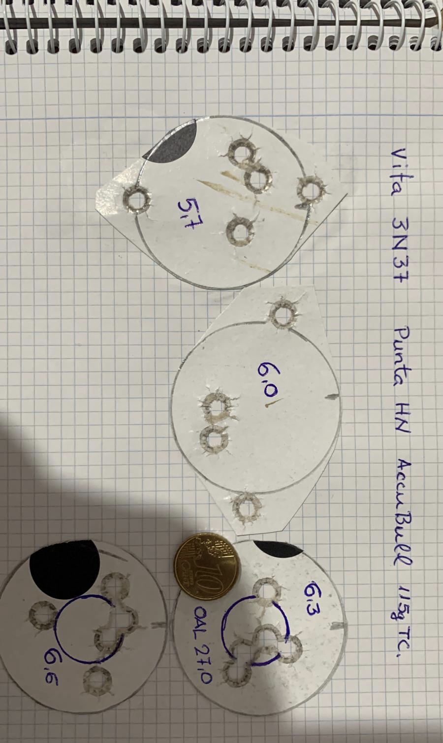 Las recargas que hago para la destroyer del 9 Para, y me van bien, son 3,7gn de RS12 y punta FMJ de 115gn ojival.
