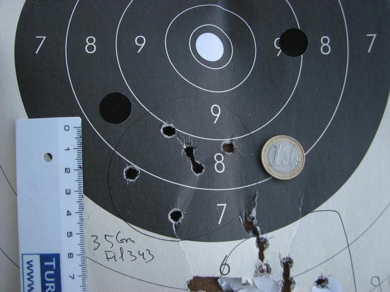 Las cargas con Fil-343 las hice para ver como se comportaban los proyectiles de plomo a más velocidad, ya que en muchas tablas de recarga americanas en la recarga con puntas de plomo rondan esas velocidades, aunque la mayoría las utilizan para tirar a siluetas metálicas.