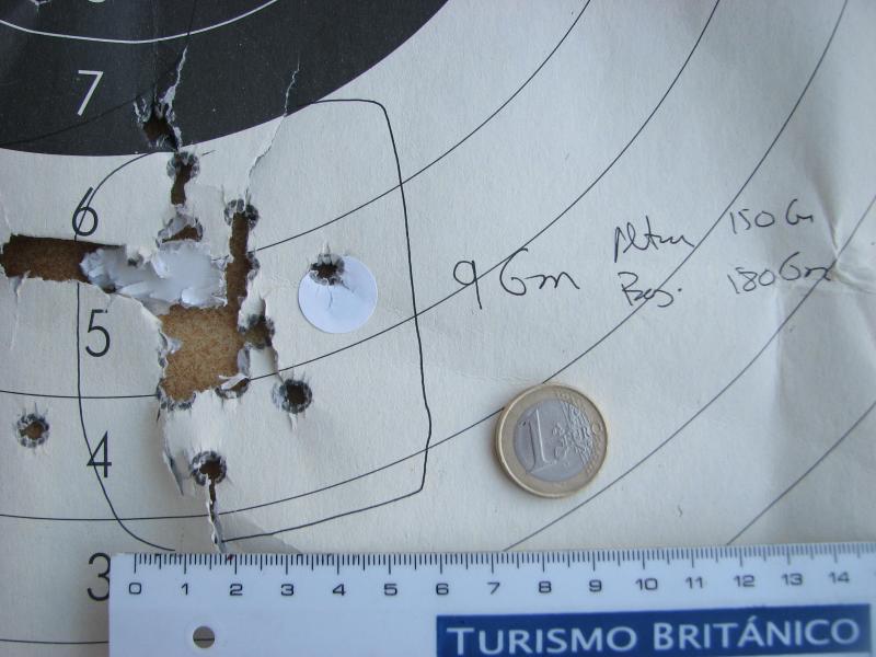 Tengo que decir que las agrupaciones a 50 metros con las cargas de 12, 13, 14 y 15 grains no han sido satisfactorias, y de las otras pongo una foto, creo que no son muy buenas pero lo dejo a vuestro juicio. Sin embargo con una carga media de Fil- 343 en la que se alcanzan los 616 metros por segundo, las agrupaciones mejoran bastante.