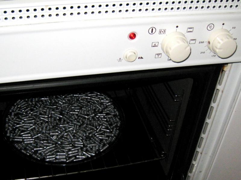El ensayo de hoy ha consistido en calentar la producción de una hornada, 400 puntas RCBS 30-150-SP formadas con mi aleación de arma corta 12BH, durante hora y media en el horno de la cocina de casa a 250ºC partiendo de temperatura ambiente, es decir sin precalentar el horno para que las puntas adquieran temperatura simultaneamente con el horno. Creo que después de hora y media se puede concluir que se han calentado hasta el núcleo.