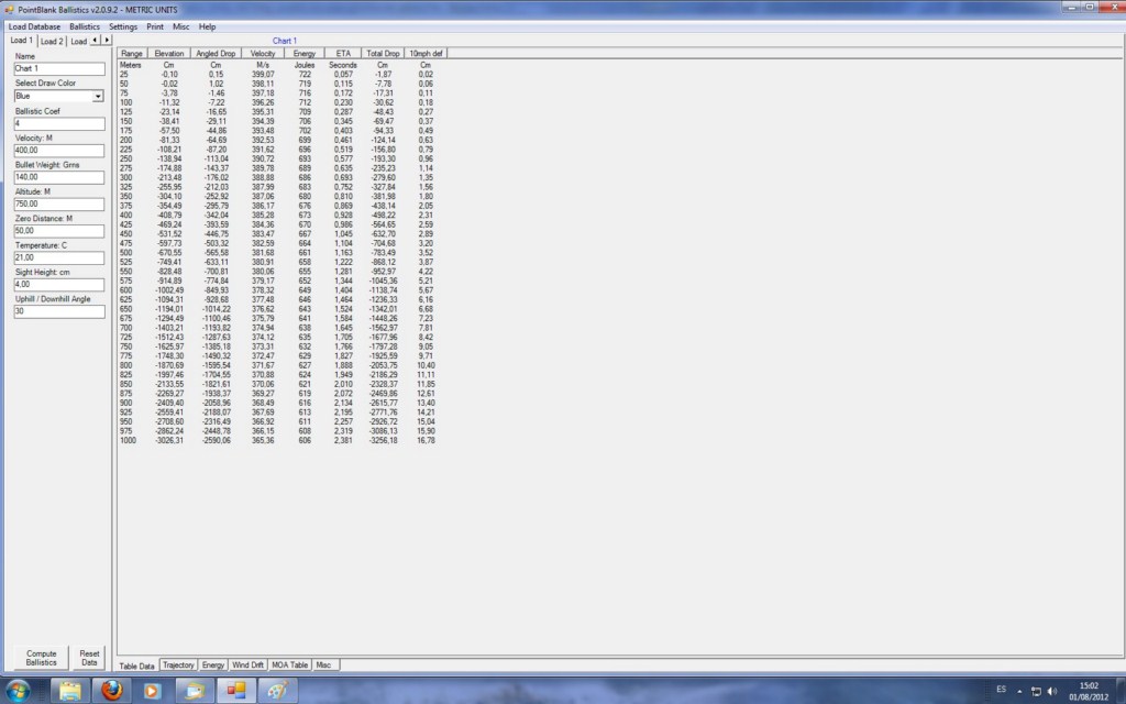 Si si he entendido que busca cargas subsonicas pero aun con la polvora de IMR la velocidad mas baja que podria alcanzar seria unos 400 mts/seg por encima de la velocidad del sonido, con respecto a los datos y las tablas te comentare que por la red puedes encontrar software para el calculo balistico, yo en concreto utilizo este es el PointBlank v2.0, aqui te dejo unas capturas de pantalla, la que aparece como Chart 1 esta cvalculada con puntas de 140 grain y con una velocidad de 400mts/seg y la que pone Chart 2 es la misma pero con una velocidad de 900mts/seg fijate en las caidad del proyectil y la energia que entrega ya veras que pasada.