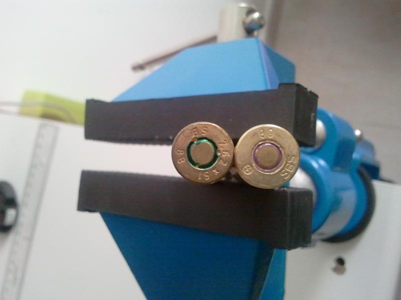 He hecho una a los dos culotes de las vainas y vereis que ya incluso el color del circulo del pistón es de otro color además del marcaje del calibre.Siendo la verde un berdan.
