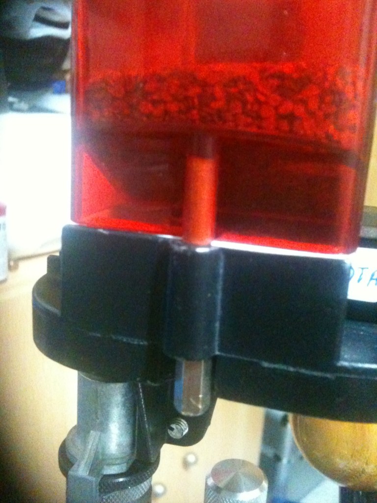 Teniendo en cuenta que yo nunca he utilizado los discos ya que me parece mas practico y fiable el micrometro, la modificacion que le hice a la salida de la tolva como podreis apreciar en la fotografia, de fabrica sale rectangular, pues yo con una pequeña lima lo que hice fue la parte donde hace la curvatura el micrometro limarla para que esta quede a la par, de este modo cuando el dosificador vuelve a su posicion de reposo queda abierto el paso entero desde la tolva al micrometro llenando asi mejor la cavidad.