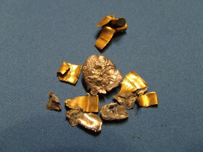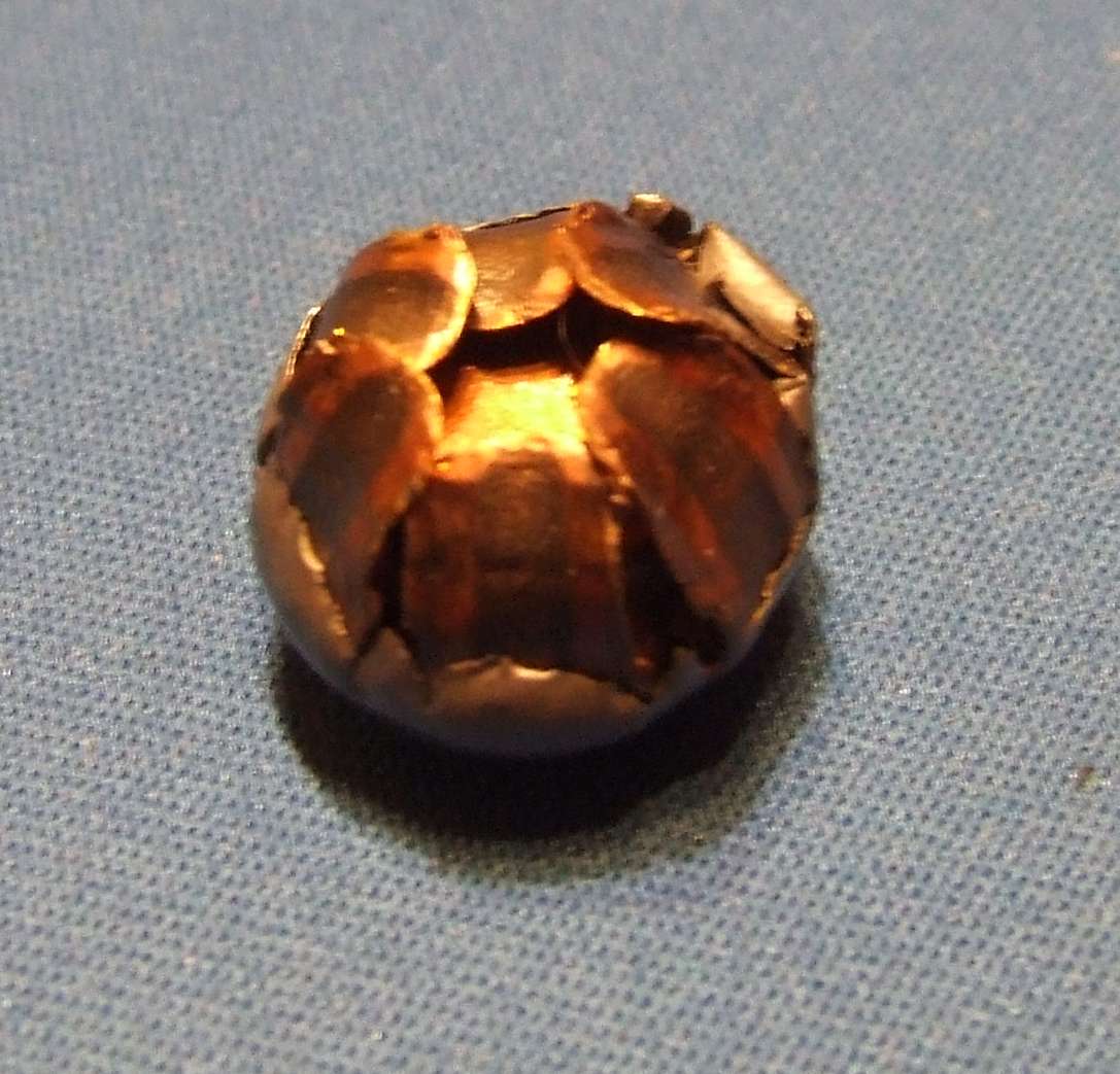 Conclusión, los tres proyectiles tienen aparentemente la misma penetración en un medio como es el agua contenida en bidones. Los restos de los proyectiles, todos, son recuperados en el INTERIOR, del tercer bidón. La punta Hornady FTX se separa su nucleo de la camisa y pierde pequeñas y pocas esquirlas aunque mantiene un nucleo suficientemente grande. La punta RG se fragmenta en muchas y pequeñas esquirlas, se separa el nucleo de la camisa y esta última también se rompe en muchos trozos, no obstante, la penetración en los bidones es semejante a las demás. La que ha quedado impoluta y como campeona ha sido la Remington, la camisa ha abierto sus petalos totalmente hacia atrás, ha contenido el nucleo de plomo y ha hecho un hongo precioso, eso si, al expandir tanto no ha llegado a tocar violentamente la parte trasera del tercer bidón pues el plomo ha quedado pulido por el agua sin daño alguno, mientras que las otras dos puntas (que han quedado dentro del bidón, repito) han chocado contra el bloque de cemento trasero y el plomo a reproducido la forma de los granos de dicho bloque.