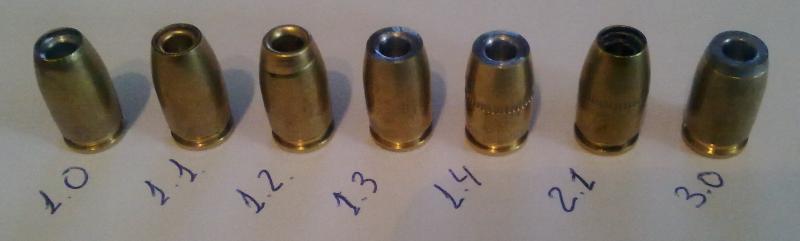 Correcto, así lo veo yo también, es mas, después de estar midiendo y estudiando el tema, hasta en 4 pasos, pues usan la vaina del 9mm para hacer el proyectil del .40S&W, y para el 9mm una del .223, pero esta hay que recortarla y además difícil de conseguir en cantidades por aquí, sin embargo la del 9mm se podría pasar por un primer díe que te redujera el diámetro en 0.60mm aproximadamente dejándola para su ultimo ajuste con el ultimo die de recalibrar, también el sobrante de vaina podría plegarse hacia dentro del hollow-point con el cierre en estrella.