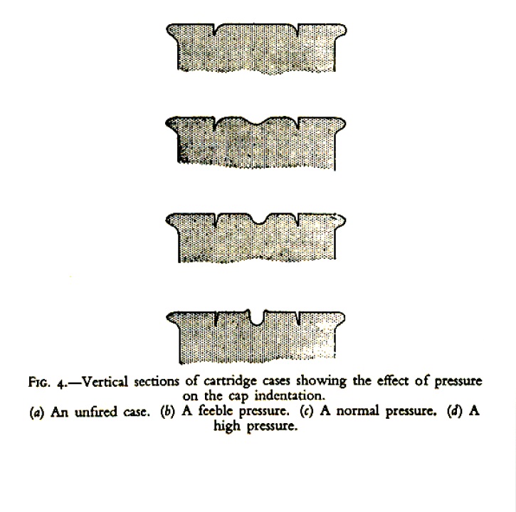 Entendería que empieza a haber sobrepresión si además de aplanar completamente el pistón, la huella de la aguja forma una especie de cráter al rellenarse el hueco entre la aguja y el grano de fuego con el metal del propio pistón, como en el último ejemplo de estas secciones, en las que aparece un pistón sin percutir, uno con escasa presión, uno normal y uno con presión elevada.