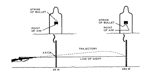 En cambio si ya tenemos regulado nuestro fusil a por ejemplo 300 metros (cero militar clásico) después de un largo tiempo sin tirar o de un viaje, golpe (dios no quiera) o algún otro suceso deseamos verificar el cero pero no tenemos espacio suficiente para hacerlo colocamos un blanco a 25 metros y hacemos tres disparos los cuales sabemos deben dar por ejemplo; 3,5 centímetros sobre el punto apuntado. Si los impactos dan a la altura esperada significa que darán a 300 metros.