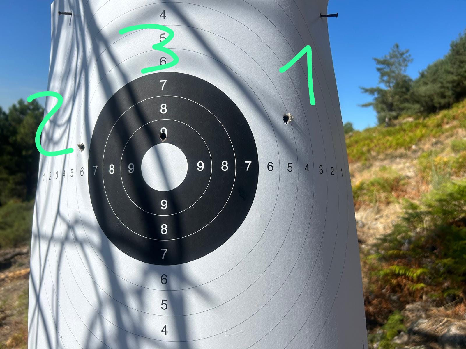 Mi sorpresa es que tras medir donde pegaba la bala con una información que leí en esta pagina vi que al ser un cuarto de moa el visor en teoría a 100 metros debería moverse 0,77 cm con cada click así que cogí la calculadora y dije 14 centimetros entre 0,77 cm de cada click me salieron 18 click a la izquierda, mi sorpresa en el segundo disparo fue que me vario de un disparo a otro 2,5 cm en altura (que deberia ser 1,5 aprox) y 25centimetros en horizontal cuando mi calculo fue a 14 solo, cogi y le di 8 click a la derecha sin medir cuanto era calculando que serian unos 6 cm y medio y pegue justo en el centro, cuando lo medi con 8 click me habia movido 11 cm, entonces segun mis calculos en mi visor a 100 metros cada click equivale a 1,375 cm casi el doble de 0,77 como deberia ser, ya que en las torretas pone 1/4 moa a 100 yardas, el caso que el rifle parece que se ha quedado bien pero no me cuadra nada y ya empiezo a pensar que me vario yo pero es que me parece demasiado para variarme teniendo en cuenta que tiro en un banco de tiro encima de una mesa y yo sentado, la mesa no era la mas estable del mundo pero no se me movia apenas, cual es vuestra opinion? El visor esa ma? esta bien? os dejo foto de los tiros, muchas gracias por adelantado!!