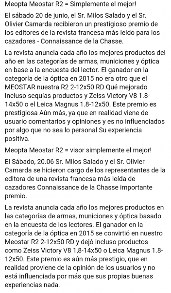 Un poco más económicos ( por no decir otra cosa ) están los Meopta de la serie MeoStar2 los hay en 1,7-10×42 o 2-12×50 y en cuanto a calidad no están tan lejos de los top.........en calidad-precio es de lo más competitivo. Saludos