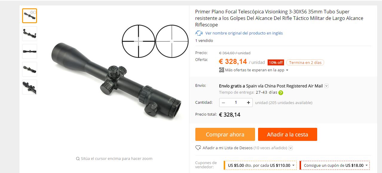 Tecleas en la ventanita de busqueda de Aliexpres, cualquiera de las tres marcas que te he puesto, mas la palabra "scope", que es visor en ingles, y te salen todos los modelos, luego , te fijas en el lado izq de la pagina, y eliges, de baja, media, o altos aumentos, y te compras el que mas te guste. Por ese dinero, te puedes comprar uno de los mas modernos, de multiplicador de zoom X10, o uno FFP (first focal plane) con reticula en primer plano focal, que aumenta o disminuye la reticula con el zoom, manteniendo la proporcion entre puntos mil-dot, para hacer mediciones de distancia muy aproximadas con la reticula.