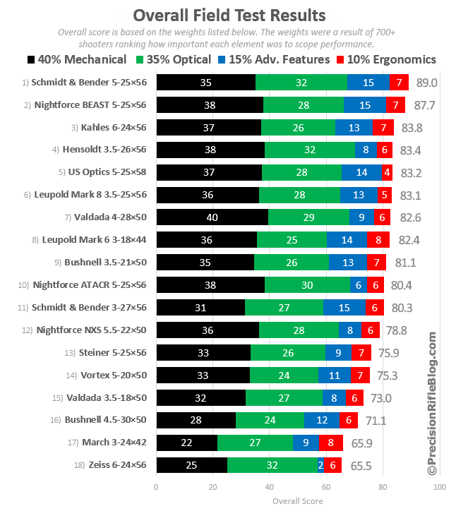Una grafica comparativa de los mejores visores, tipo tactico, actuales, o sea, de los fabricados para soportar caña, y un trato duro, y aguantar miles de tiros, secos, o mojados, con frio, o con calor. Fijaros, como el que mas puntuacion lleva en el apartado mecanico, es Ior Valdada..........