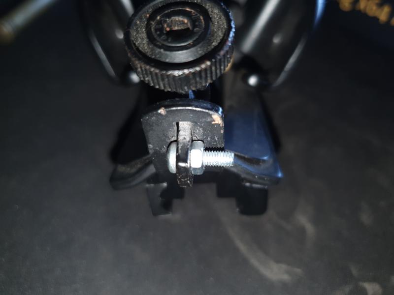No lo veo muy bien en las fotos pero se suele utilizar para piezas que se monten y desmonten habitualmente y para las que requieren reglajes frecuentes. Prueba a quitar el tornillo del bípode y sustituirlo, si es de la misma medida, por la pieza.