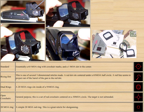 Perdona compi pero tengo 3 versiones de Bushnell Holosight, 1, 3 y 4, es decir, la primera que es un ladrillazo, la 3 que es más compacta y la 4 que es la mini, por así decirlo, me falta el gen 2 que es el japonés si no me equivoco, y ninguno de ellos tiene retícula intercambiable...o al menos desconozco como se le cambia la retícula, tienen brillo regulable y poco más...