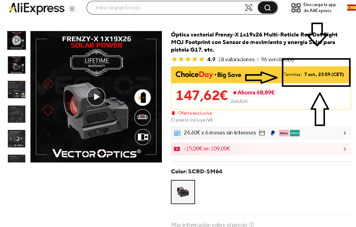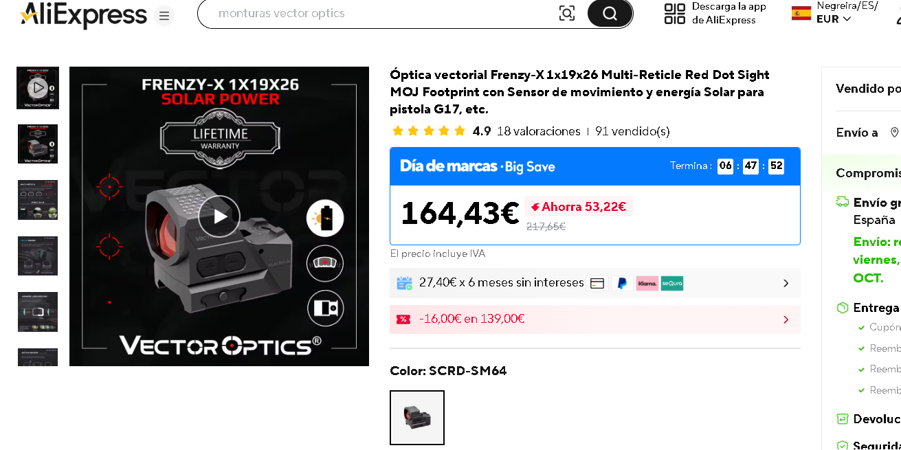 El caso es que estoy interesado en un punto rojo de Vector Optics, el Frenzy-X 1x19x26 MRS GenII Solaire Multi-reticle, y esta página lo vende por 170 € que son unos 70€ menos de lo que lo vende la propia Vector Optics en su página oficial. Por mucho descuento que tengan por comprar cantidad me parece muy raro,