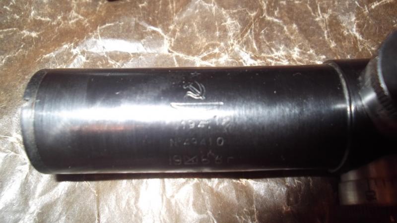 En las imágenes se aprecia que el visor tiene tres grupos de marcajes, aparentemente realizados en fechas distintas. En el de más arriba, la estrella de cinco puntas y la hoz y el martillo son símbolos evidéntemente soviéticos. El marcaje que hay debajo de la hoz y el martillo es una lente plano-convexa, la cual indica quien fué el fabricante del visor. En 1.936 la URSS hizo un contrato con la compañía alemana Karl Zeiss para que instalaran en la ciudad de Leningrado una fábrica para la fabricación de aparatos ópticos, con el nombre de "Progress". En el año 1.941 se trasladaron a Omsk. Debajo de este logo de la marca figura el año de fabricación, y por último el nº de serie (que puede comenzar como en este caso por Nº, o por NºA o Nº seguido de la letra cirílica que se corresponde con la "A").