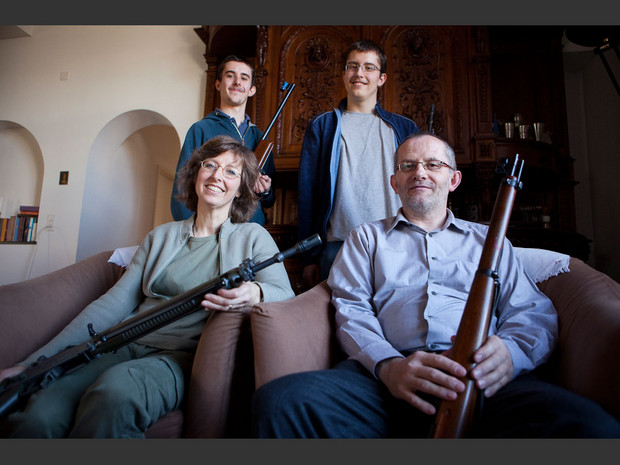 Todos los varones en edad militar (desde los 18 hasta los 40 años) guardan en su casa un precioso fusil AUTOMATICO SIG 556!!! Tengo un yerno suizo y he podido ver su fusil depositado en lo alto de un estante del garage de su casa junto a un par de cajas de munición.